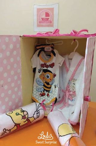 Τα Diaper-Cake ήρθαν για να εντυπωσιάσουν…Το Loulis Sweet Surprise σας δίνει την δυνατότητα να κάνετε μία ξεχωριστή «τούρτα» δώρο που περιέχει βρεφικές πάνες, αξεσουάρ ακόμα και την προίκα του μωρού. ‘Ενα πρωτότυπο δώρο γέννας, βάφτισης, γενεθλίων. Ακόμα αναλαμβάνουμε τον σχεδιασμό πρότασης της δικής σας εκδήλωσης, βασισμένο στις επιθυμίες της κάθε εταιρείας ή σχολείου. Η διεξαγωγή του προγράμματος πραγματοποιείτε σε χώρο της επιλογής σας. Αξίζει να σημειωθεί πως το κατάστημα οργανώνει θεματικά parties γεμάτα με μουσικοκινητικά παιχνίδια και δημιουργική απασχόληση!
